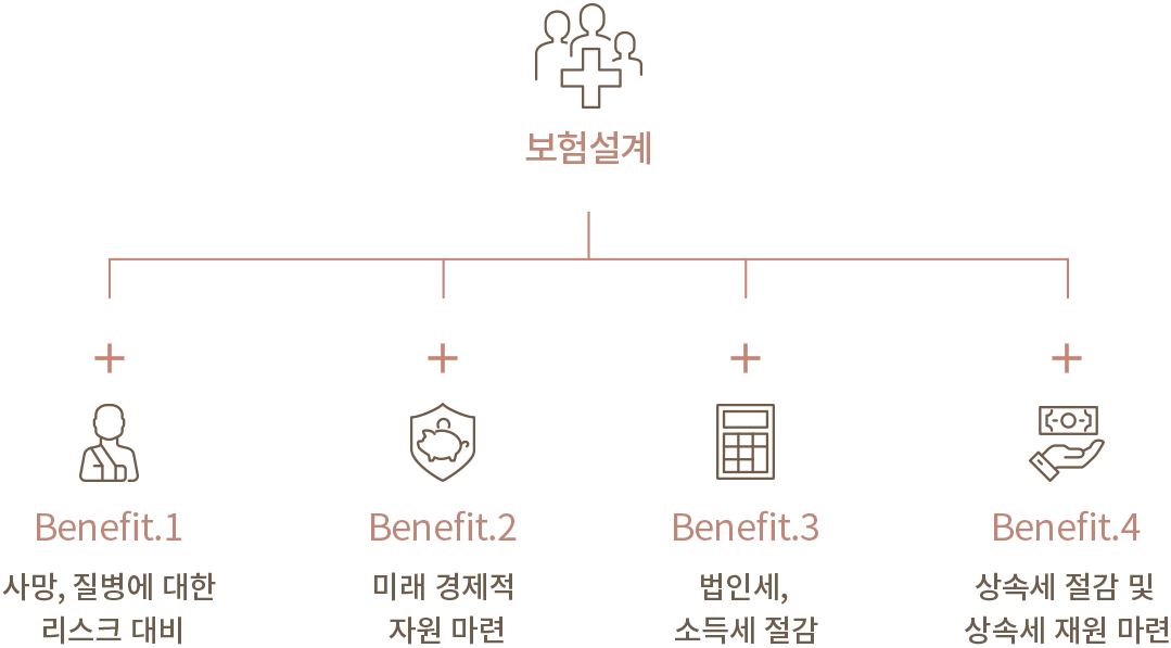 마련, 대표자 사망리스크 보장, 개인 은퇴 및 재무설계, 상속세 재원 마련 등의 다양한 절세 및 리스크 대비 방안을 제시해 드립니다.
